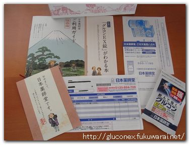 グルコンEX錠と、用法や用量の説明、会社のPRや、定期お届けコースの注文書などなど...ま、とりあえずモノと用法・用量さえ、わかればいいさ。